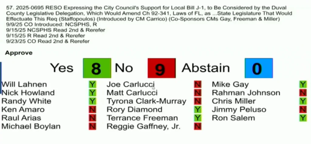 Council members Raul Arias, Ken Amaro, Michael Boylan, Joe Carlucci, Matt Carlucci, Tyrona Clark-Murray, Reggie Gaffney Jr., Rahman Johnson and Jimmy Peluso voted against the J-bill request.