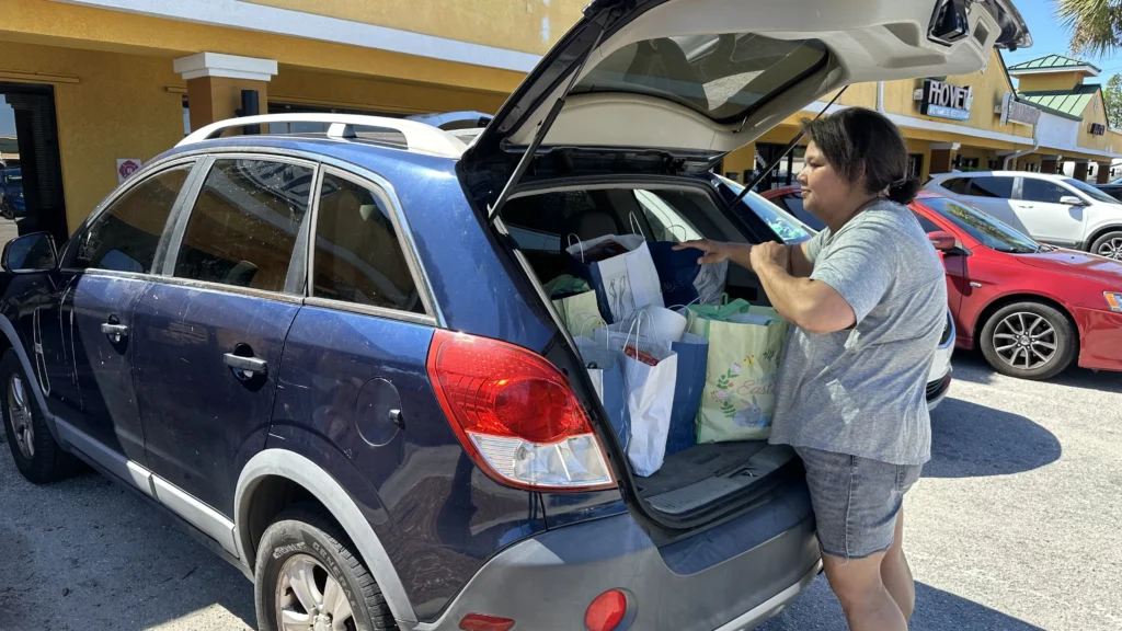 Lana Reed is loading her car trunk with bags of food from BEAM. She lives just off A1A, works at a nearby middle school and has a family of five.