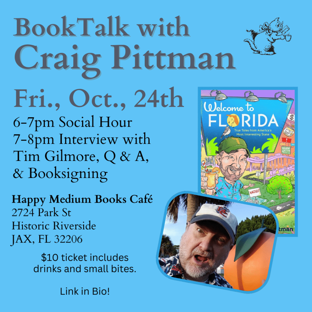 Head to Happy Medium Books Café for a lively conversation between New York Times-bestselling author Craig Pittman and local author Tim Gilmore. Pittman, a native Floridian, award-winning environmental reporter, and co-host of the Welcome to Florida podcast, is known for his sharp, funny takes on the Sunshine State. He’s the author of seven nonfiction books, including Oh, Florida!: How America’s Weirdest State Influences the Rest of the Country.