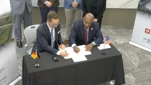 Nat Ford, CEO of the Jacksonville Transportation Authority, right, and Clemens Regier, chief financial officer of Holon, sign the agreement to build the German company’s first U.S. plant on the Jacksonville’s Northside. | JTA