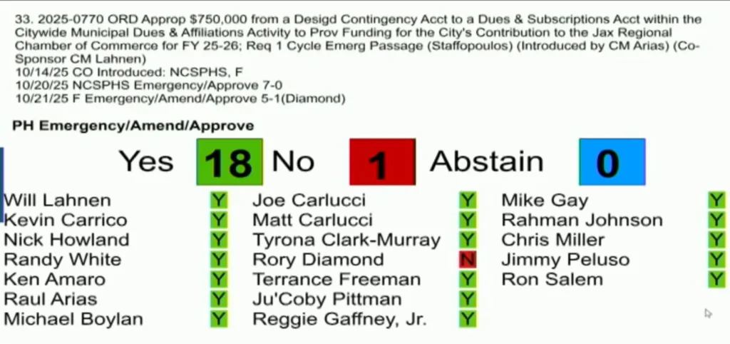 The 18-1 vote to provide funding to the Jacksonville Chamber of Commerce’s economic development division is not unusual historically. But council’s move to ask JaxUSA for additional documentation in the form of receipts to show more precisely how it spends the money before greenlighting the appropriation is a new precedent.