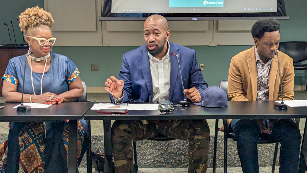 Jacksonville City Council members Ju’Coby Pittman, Rahman Johnson and Reggie Gaffney Jr. (l-r) propose devoting $2 million in emergency funding to help with local food assistance. Their districts have a combined 17,604 households that receive SNAP benefits. | Will Brown, Jacksonville Today
