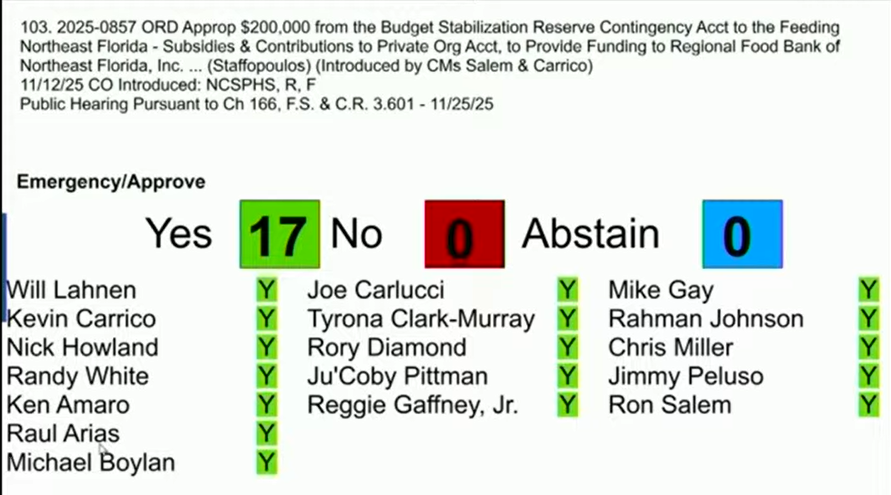 The “SNAP Gap Relief Act” proposal (Ordinance 2025-0858) filed by members Ju’Coby Pittman, Rahman Johnson and Reggie Gaffney Jr., would take $1 million from the city’s general fund reserves and $1 million from the council’s contingency fund to support Feeding Northeast Florida.