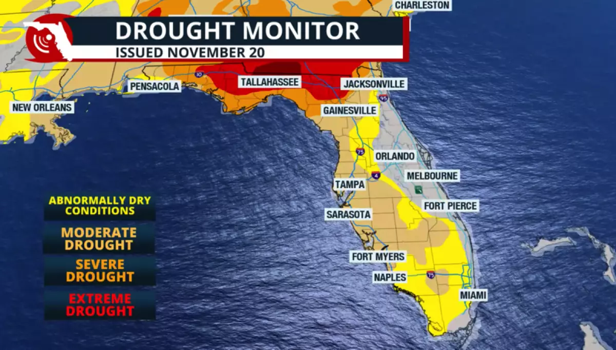 Lake Okeechobee and its surroundings also have a slight fringe under a moderate drought. Southeast Florida has also expanded its drought coverage, and we start the week before Thanksgiving with abnormally dry conditions across Palm Beach, Broward, and the interior of Miami-Dade County.
