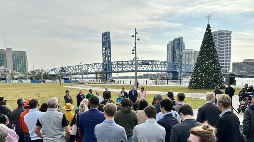 With a recently trimmed Christmas tree on the plaza lawn, the Jacksonville mayor and other dignitaries heralded the Northbank’s brand new park at a ceremonial ribbon cutting.