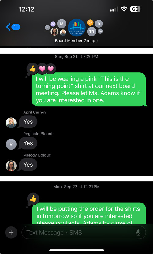 From the dais during that meeting, Joyce said she’d asked the board in a group chat who wanted shirts.