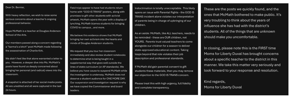 “We didn’t feel like that alone warranted a letter to you,” the email reads. “However, a deeper dive into Ms. McMath’s posts have found us deeply concerned about bringing her personal (and radical) views into the classroom.”