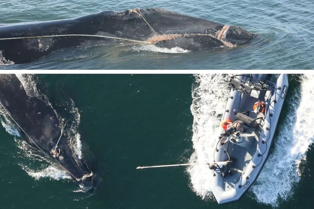An endangered North Atlantic right whale was rescued from entangled fishing lines off the coast of off St. Marys, Georgia.
