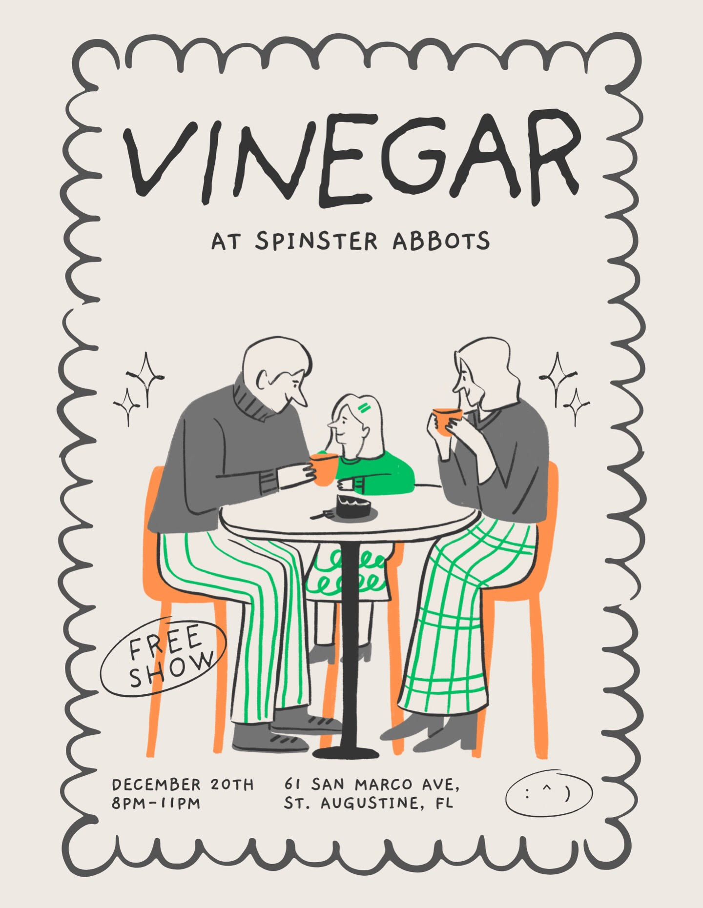 If you’re looking for a Saturday night plan that’s a little different, head over to Spinster Abbott’s. Vinegar is making the drive up from Cocoa for their St. Augustine debut, and they’re bringing a three-hour set of all-original music with them. The band is known for high-energy live shows that lean into alt-rock and psychedelic jam territory, so it could be a fun break from all of the holiday music that dominates this time of year. Stop by, grab a drink, and help welcome them to town!