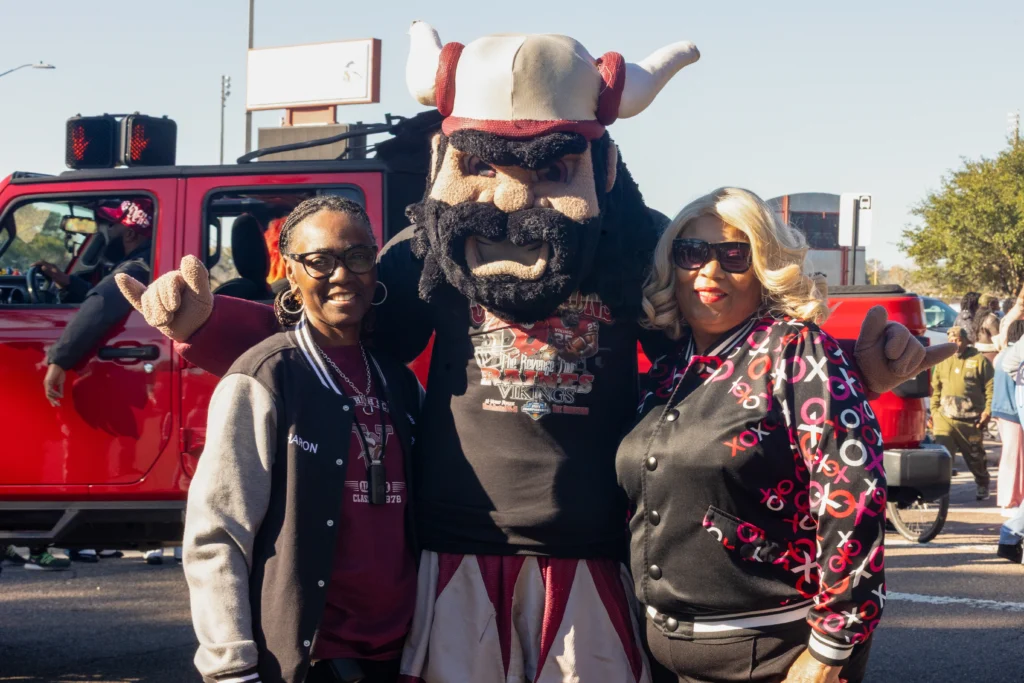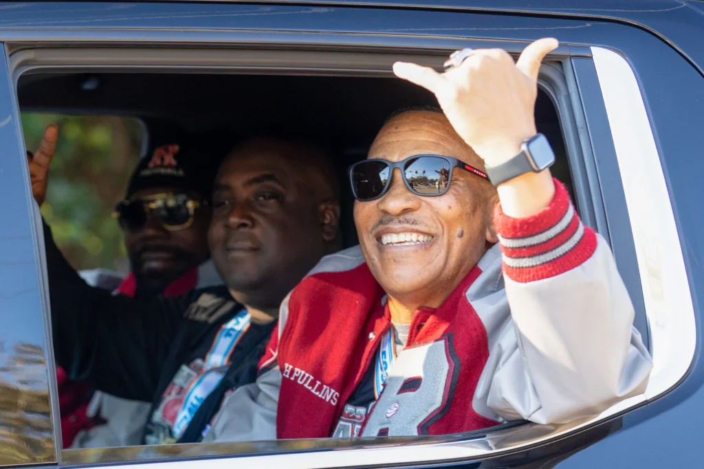 Johnny Randolph, seated right, is a 1974 Raines High graduate who played for the Vikings during their 1973 appearance in a FHSAA state final. He says he “loved every second” of this year’s team finishing 14-0 and winning a FHSAA state championship. Terrell Randolph, left, Dr. Courtney Edwards Randolph, seated left, and their nephew, Jaden, were among the thousands who attended a community parade to celebrate the 2025 Vikings on Saturday, Dec. 20, 2025. | Will Brown, Jacksonville Today