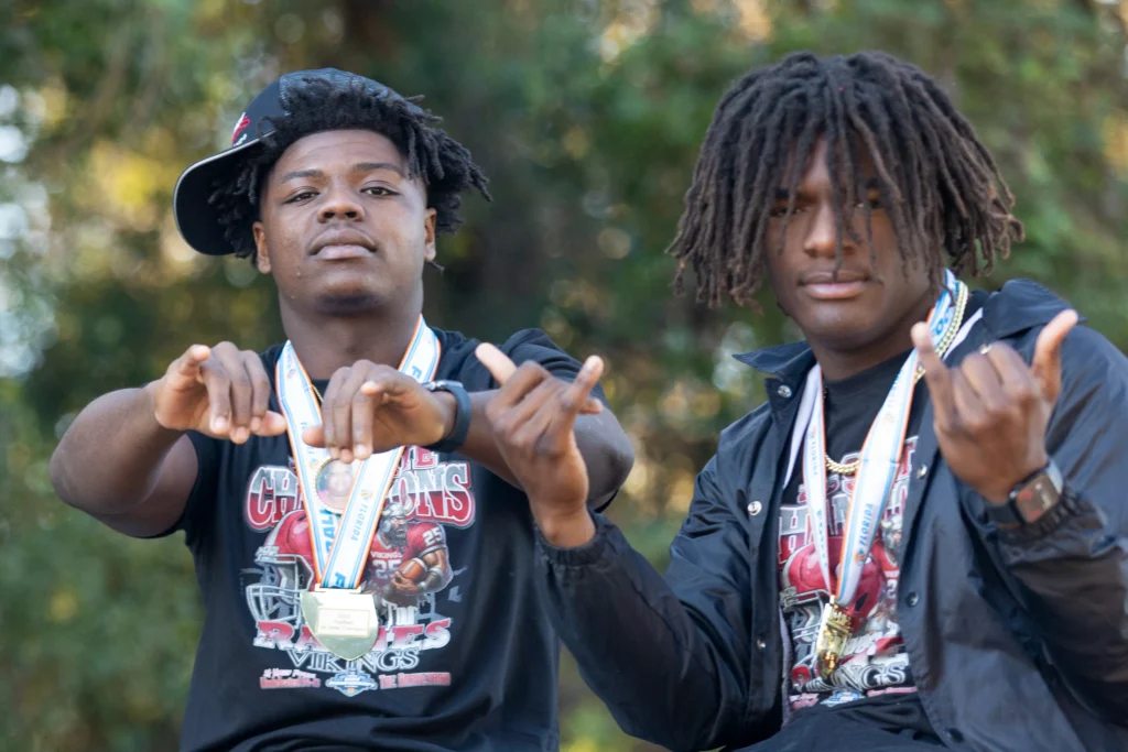 Raines freshmen Ameer Mabane, left and Nicholas Davis, right, celebrate the team's 14-0 season during a community parade. Jacksonville celebrated the Raines Vikings winning the FHSAA Class 3A state football championship with a community parade on Saturday, Dec. 20, 2025. | Will Brown, Jacksonville Today