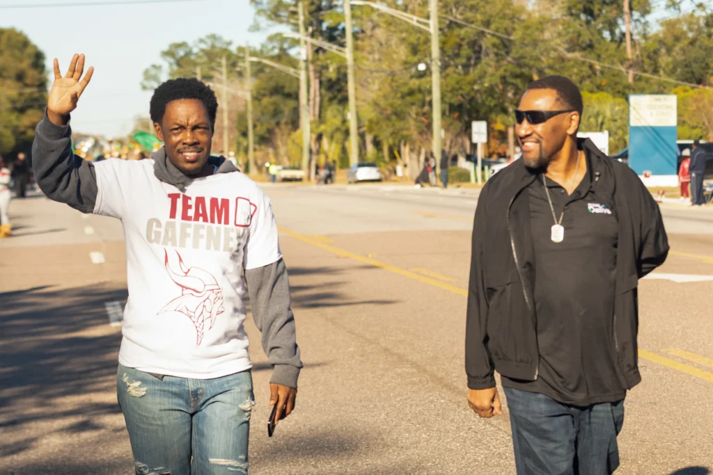 Jacksonville City Council member Reggie Gaffney Jr, left, and Duval County School Board member Reggie Blount, right, celebrated the Raines Vikings football program. Jacksonville celebrated the Raines Vikings winning the FHSAA Class 3A state football championship with a community parade on Saturday, Dec. 20, 2025. | Will Brown, Jacksonville Today