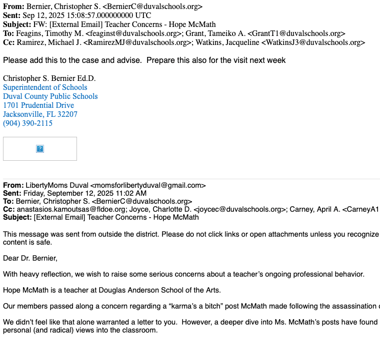 Moms for Liberty Duval emailed Bernier, State Education Commissioner Kamoutsas and Duval board members Joyce and Carney.