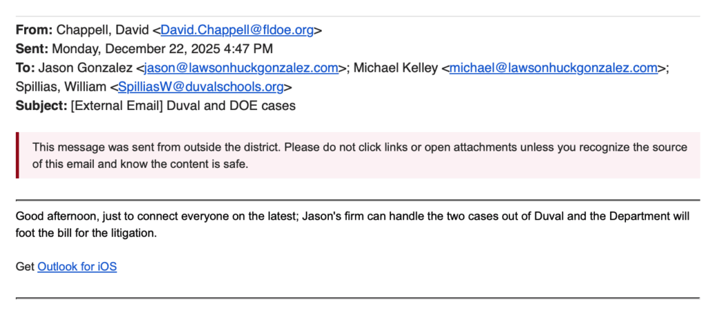 Jacksonville Today received public records showing the state Education Department arranged for the outside firm, Lawson Huck Gonzalez, to defend the district.