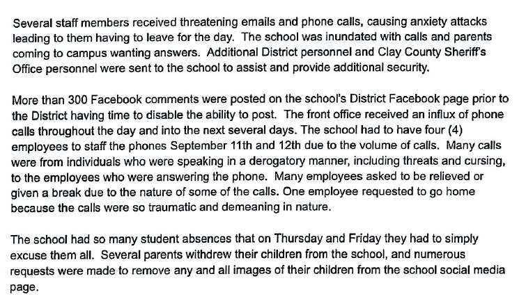 Clay County Schools immediately suspended Brock-Sanchez, who was a teacher at Ridgeview Elementary. Court filings include documentation from the district alleging Brock-Sanchez’s social media posts created an “extremely high volume of social media notifications, emails and text messages” that disrupted business at the school.