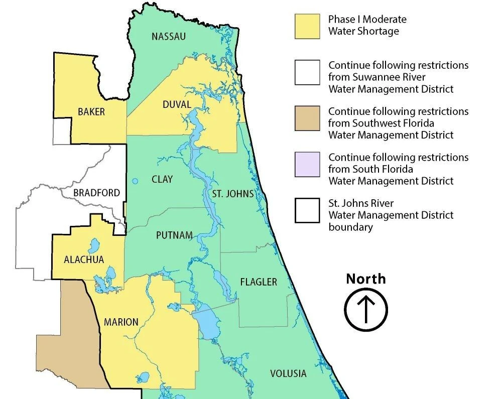 This St. Johns River Water Management District map shows the a Phase I Moderate Water Shortage for Duval County and portions of Alachua, Baker, Bradford and Marion counties. | St. Johns River Water Management District