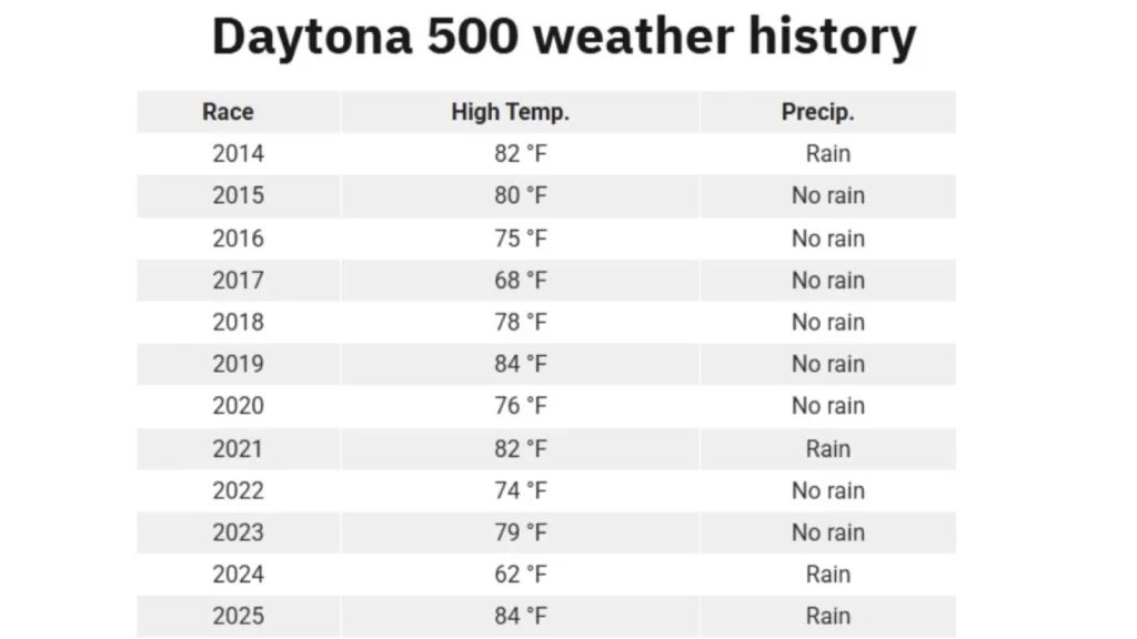 Extreme heat is relatively uncommon for the Daytona 500 in February, with the average race-day temperature of 70 degrees, based on observations since 1959.