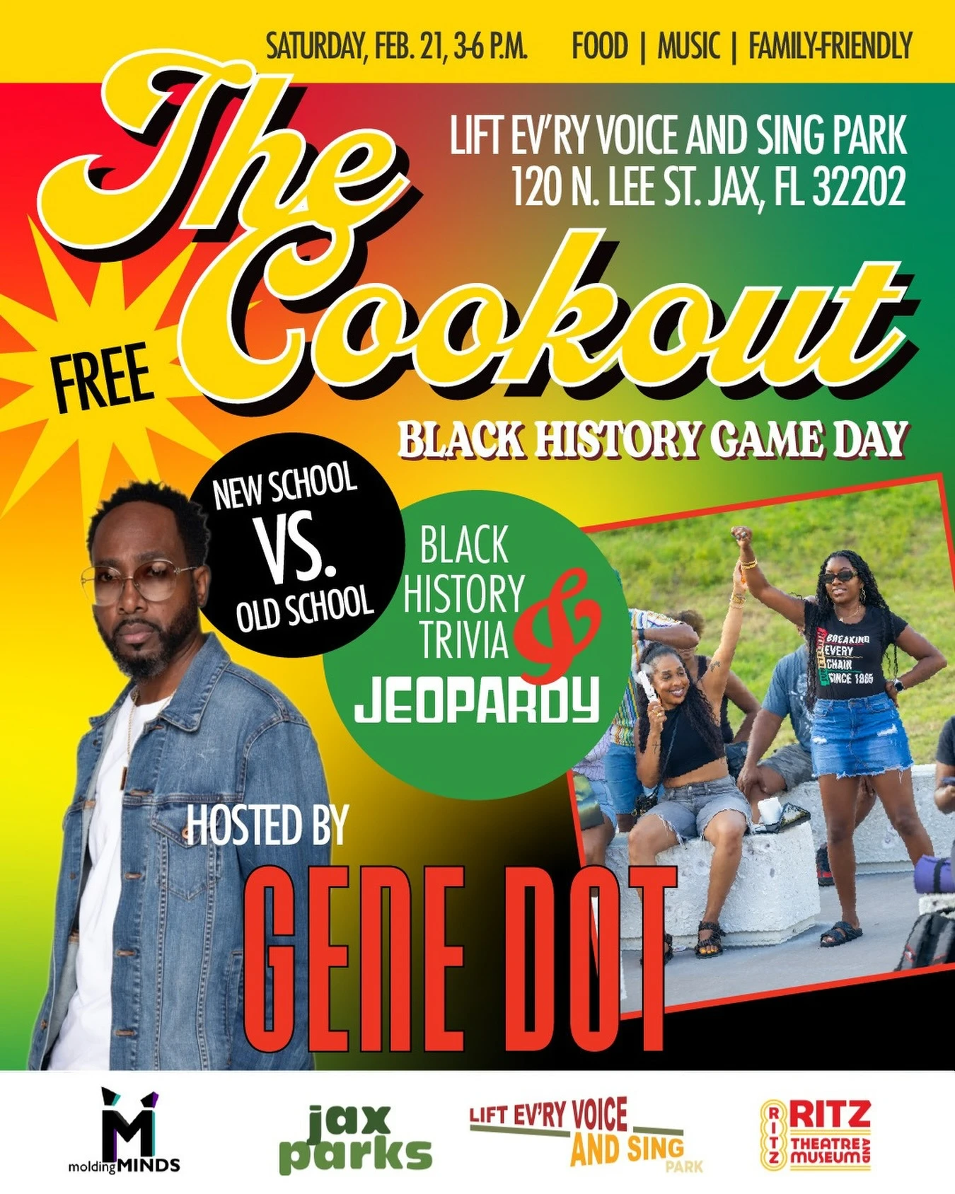 Think you know your local Black history? Put your knowledge to the test at The Cookout: Black History Game Day at Lift Ev’ry Voice and Sing Park, presented by Vibrant Places Collective, JaxParks, Molding Minds and The Ritz Theatre and Museum. This fun and friendly competition brings together Jeopardy, Family Feud, and “New School vs. Old School”-style battles, all centered on Jacksonville’s rich Black heritage. Hosted by Gene Dot Com from V101.5, the event has food trucks, youth activities, performances and games for all ages.
