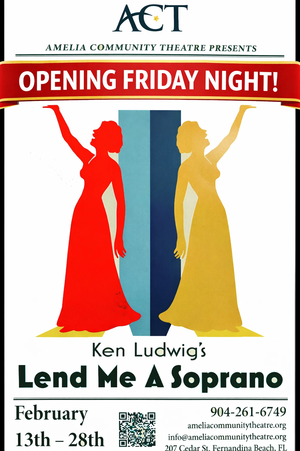The Amelia Community Theatre kicks off its 45th season with the comedy farce Lend Me a Soprano. Set backstage at the Cleveland Grand Opera Company, the play follows manager Lucille Wylie as she prepares for a one-night-only performance of Carmen starring a world-famous soprano. When the diva is delayed and her jealous husband arrives, everything unravels in a flurry of mistaken identities and romantic chaos. It’s fast, funny, and ultimately a sweet story about mentorship and finding your voice.