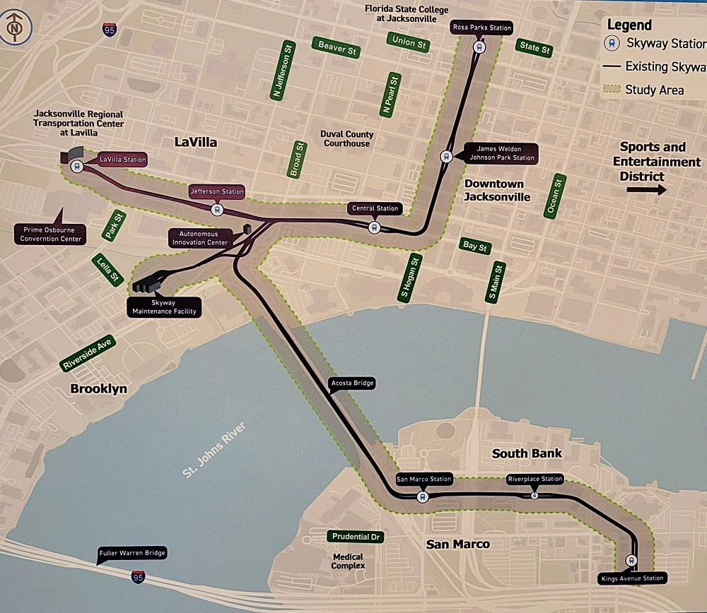 The original proposal would rebuild the existing overhead rails to handle current and future autonomous vehicles, with expansion to three Skyway stations in San Marco and the bus hub at the Regional Transportation Center at LaVilla.