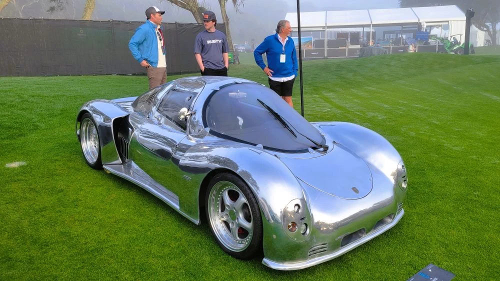 Chris Runge brought his hand-formed, aluminum bodied R2 Coupe. The second of 17 he’s made over the past few years, this one has a 3.6 liter Porsche engine visible through its back window, surrounded by curvaceous polished aluminum body work. And his inspiration came when he attended an Amelia concours years ago