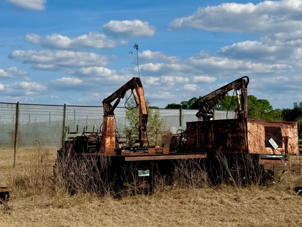 The seats and sides were moved long ago. Each has a large rectangular flat bed with a crane welded to it. A claw on the end of the crane is designed to lift large wooden crates weighing about 900 pounds and filled with oranges and grapefruit.