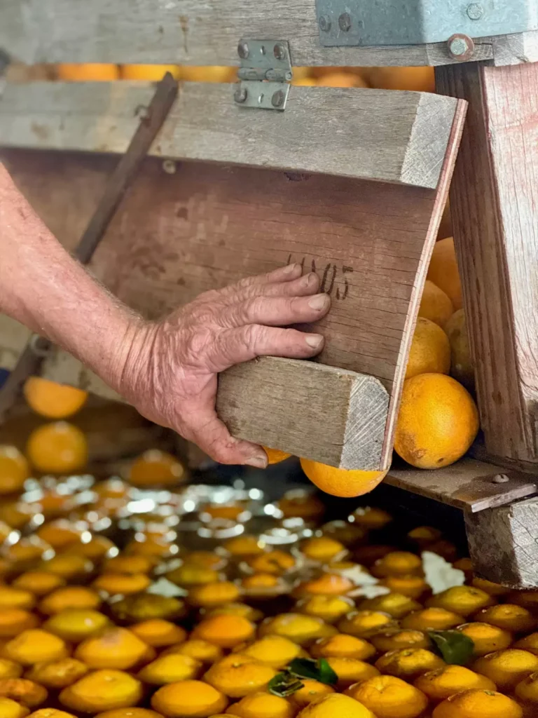 “Before we would sell wholesale everything to Tropicana, Minute Maid and Florida’s Natural by the semi-load. Now there’s so little fruit that we grow that I’m forced to sell it myself and get the premium price by selling it here,” Crump said as he leaned over to turn on a water spigot before flipping a switch to start up the fruit washer – a machine from last century.