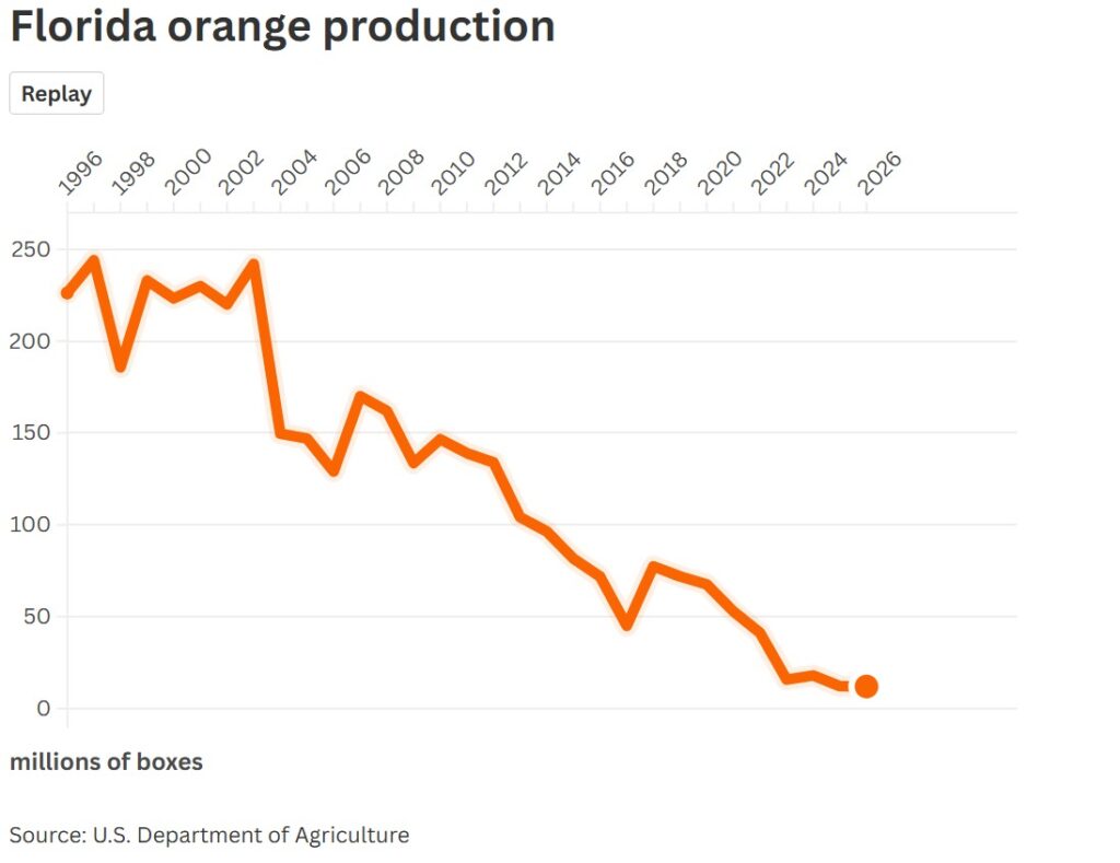 Just how far the orange crop has fallen is shocking. Thirty years ago, 225 million boxes of oranges were picked from Florida orange groves. That was almost enough for one box of oranges for every American in the mid-1990s. This year, the forecast from the U.S. Agriculture Department is 12 million boxes. That is a drop of 95% in one generation.