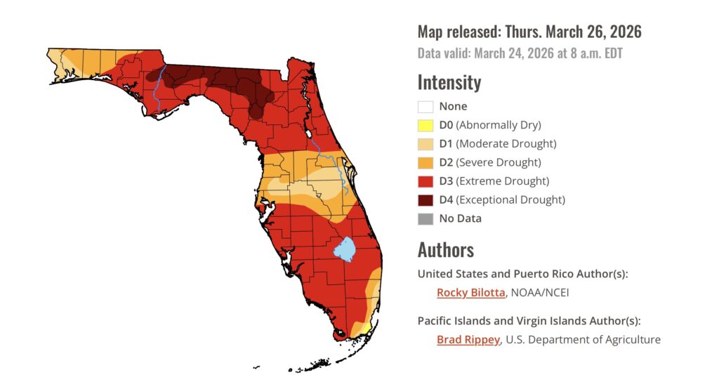 The National Weather Services’s latest U.S. Drought Monitor report, released Thursday, shows that Northeast Florida remains in extreme drought. It comes as the state is experiencing its worst drought in more than two decades.