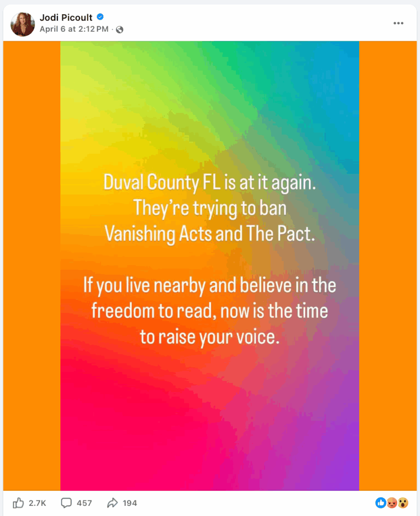 The challenges are attracting the attention of Picoult herself, who posted April 6 on Facebook: “Duval County FL is at it again. They’re trying to ban Vanishing Acts and The Pact. If you live nearby and believe in the freedom to read, now is the time to raise your voice.”
